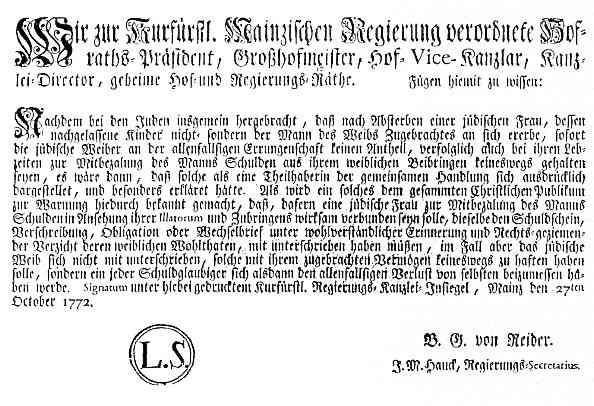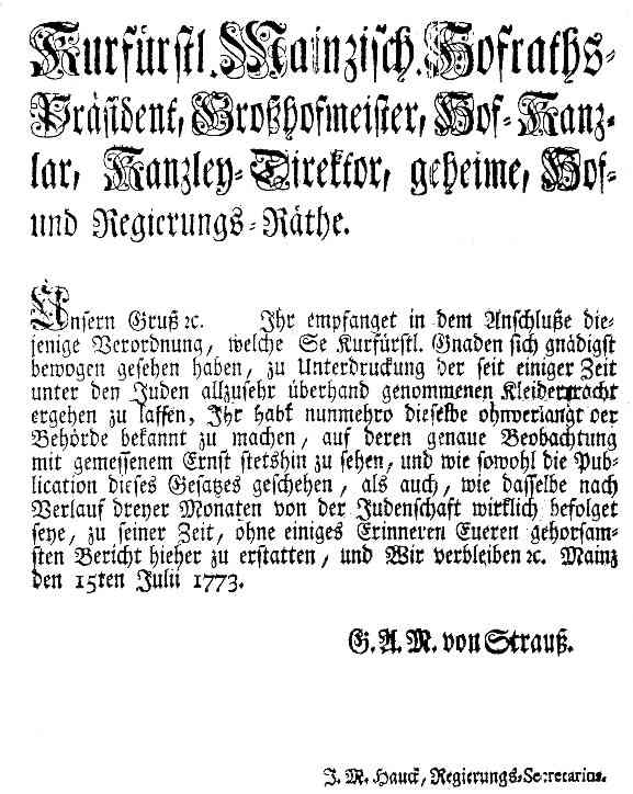 Aus dem Leben der Juden in Stadt und Amt Hofheim im 18. Jahrhundert Wenn auch im Zuge der Aufklärung und der Französischen Revolution das Thema Emanzipation der Juden auf der Tagesordnung stand, war bis zu ihrer völligen Gleichstellung in Deutschland im Lauf des 19. Jahrhunderts noch ein weiter Weg. Dies belegen u.a. auch zahlreiche das Amt Hofheim betreffende Akten der Abteilung 106 im Hessischen Hauptstaatsarchiv Wiesbaden, auf denen die folgenden Kapitel fußen. Schutzjuden und Judenschutz Als es in der Zeit der ersten Kreuzzüge zu größeren Ausschreitungen gegen die Juden kam, stellten die Kaiser sie als sogenannte Kammerknechte unter ihren besonderen Schutz. So liegt aus dem Jahr 1090 ein erstes Privileg Kaiser Heinrichs IV. für die Wormser Juden vor, das 1157 durch Barbarossa bestätigt und 1236 durch Friedrich II. auf alle Juden im Reich ausgedehnt wurde (Fritz Reuter in „900 Jahre Geschichte der Juden in Hessen", S. 42). Dieser Schutz wurde nicht unentgeltlich aus rein humanitären Gründen gewährt, er mußte vielmehr durch ein Schutzgeld immer wieder teuer erkauft werden. Da Karl IV. die Pogrome gegen die Juden im Zusammenhang mit der großen Pestwelle der Jahre 1348 bis 1350 nicht verhindern konnte, wurde in der Goldenen Bulle von 1356 dieses Regal an die Kurfürsten übertragen. So befinden sich die Schutzrechte in den folgenden Jahrhunderten in der Hand der Landesherren oder Städte, ohne daß deren kaiserlicher Ursprung in Vergessenheit geraten wäre (Friedrich Battenberg in „900 Jahre Geschichte der Juden in Hessen", S. 83).