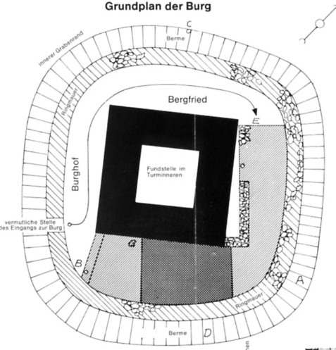 Nun zur Grabung selbst: im Inneren des kleinen Hügels wurden die Grundmauern eines quadratischen Turmes freigelegt, der eine Außenlänge von 10,50 m hatte; im Innenraum maß er etwa 25 qm. Die Mauerstärke betrug 2,75 m. Umgeben war der ganze Komplex von einer ebenfalls quadratischen Ringmauer, die an den vier Ecken abgerundet war. Diese Mauer hatte eine Stärke von 1,20 m und umschloß dabei einen Innenhof von ca. 20 m im Durchmesser.
